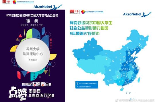 “阿克苏诺贝尔中国大学生社会公益奖”于2011年在共青团中央成人影片 部的指导下由阿克苏诺贝尔中国设立,是中国第一个以大学生社团为奖励对象的国家级社会公益奖项。旨在鼓励那些在社会公益领域有突出贡献的大学生社团,促进大学生积极参与社会公益活动,并在社会中普及公益理念,提升社会大众对社会公益的关注度及参与度。