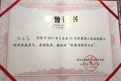 研究生获最高院第三巡回法庭“优秀法律实习生”称号
