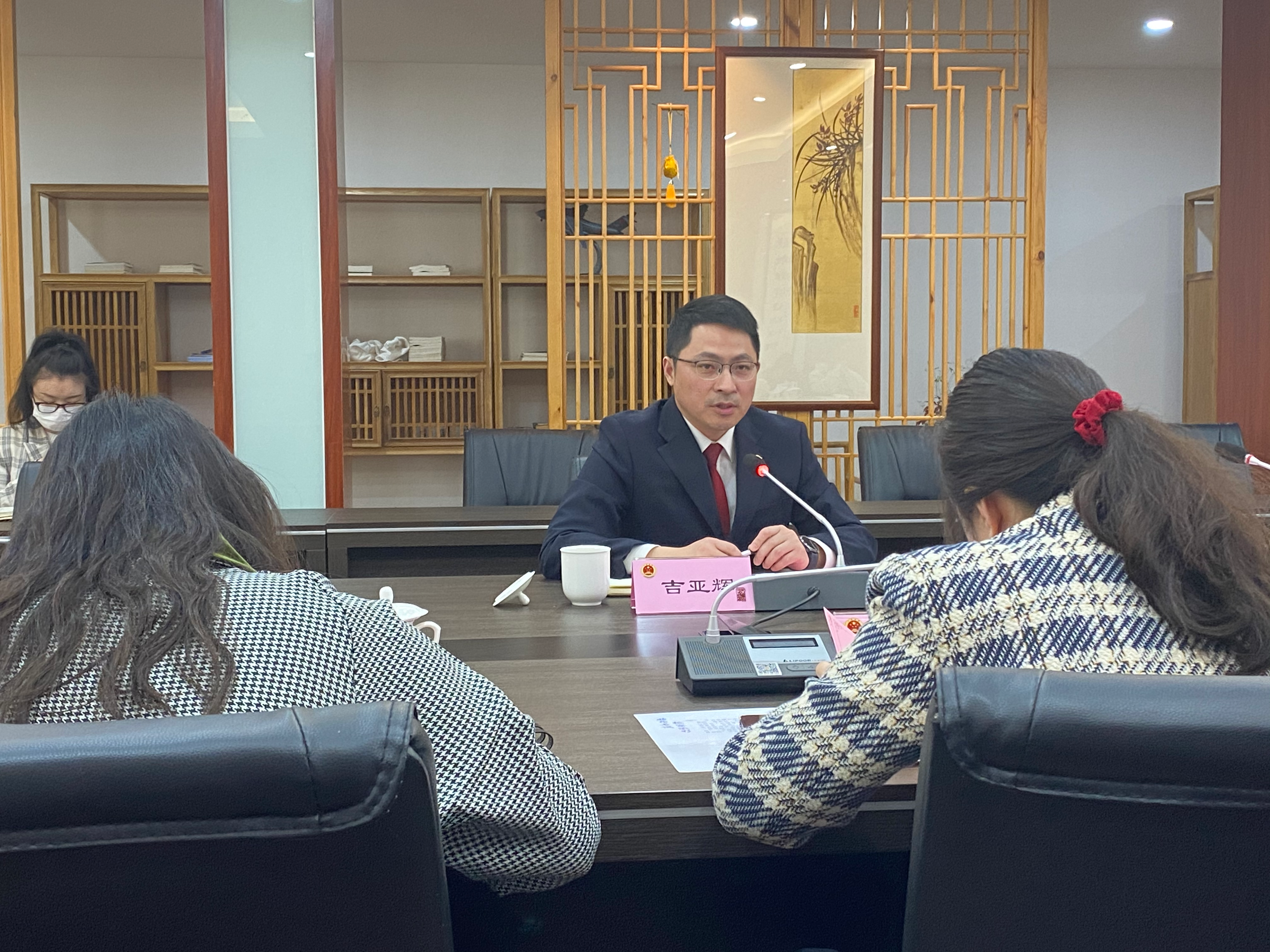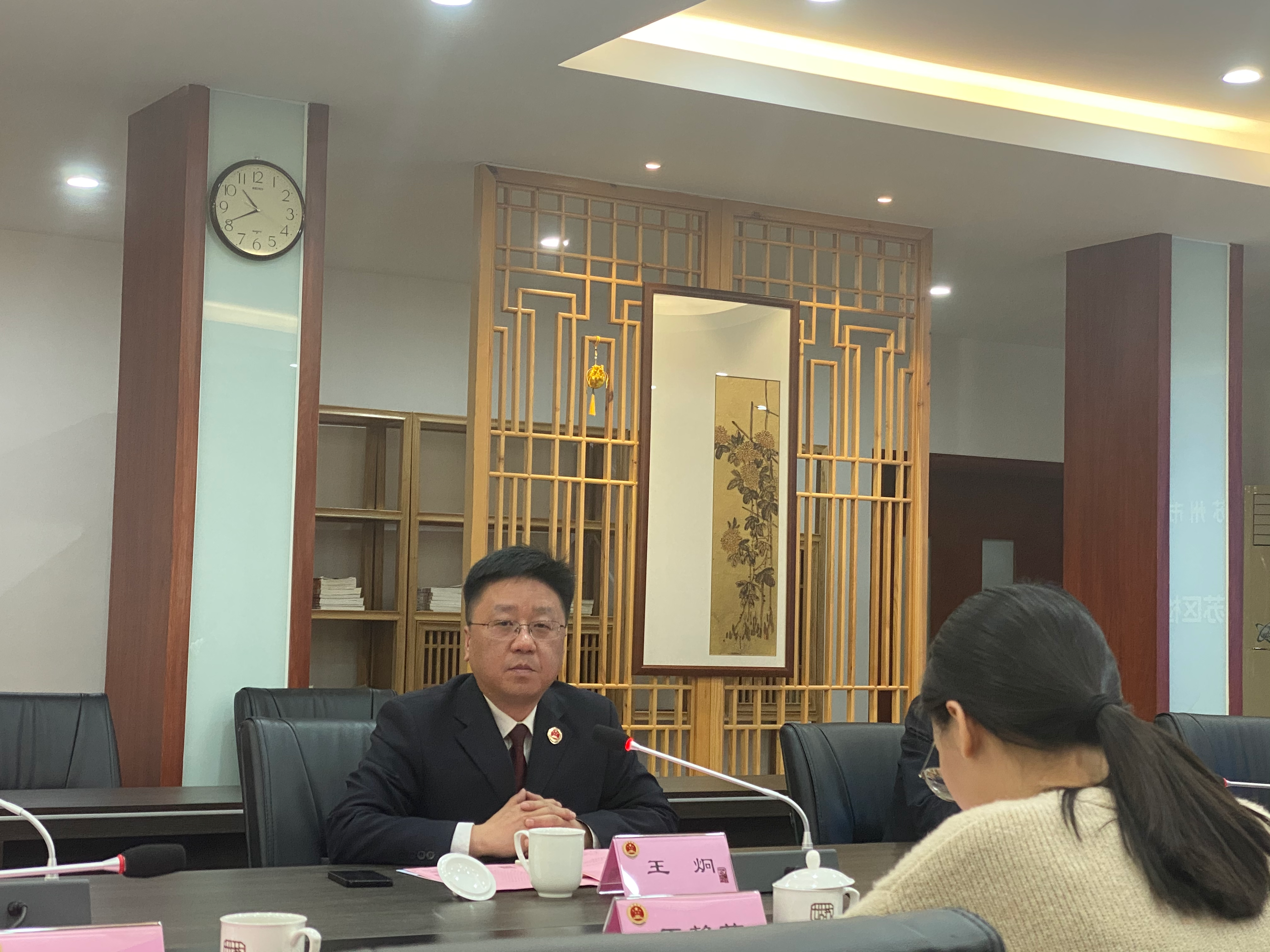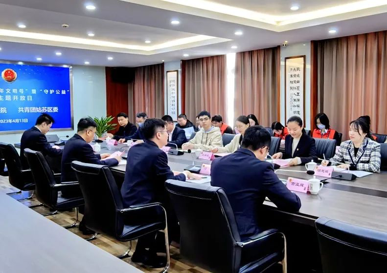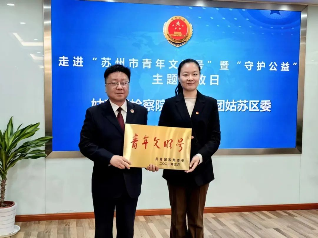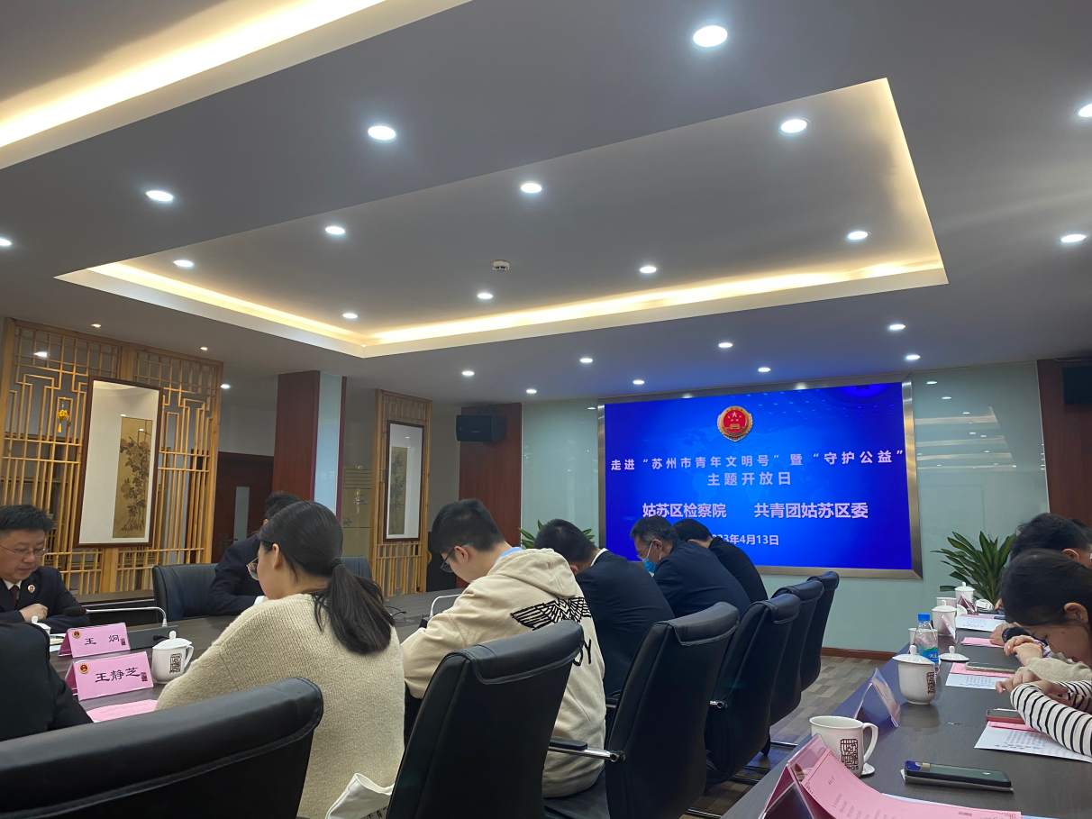 参观结束以后,“小法师”公益团参与本次走进“苏州市青年文明号”暨姑苏区检察院“守护公益”主题开放日座谈交流会。姑苏区检察院党组成员、政治部主任顾晔向参会成员介绍了姑苏区检察院概况、部门业务分工、青年人才培育、特色品牌建设、未成年人保护等现状,并重点介绍了开展公益诉讼检察的成效。随后,共青团姑苏区委副书记饶珠向第三检察部授予“苏州市青年文明号”牌匾。