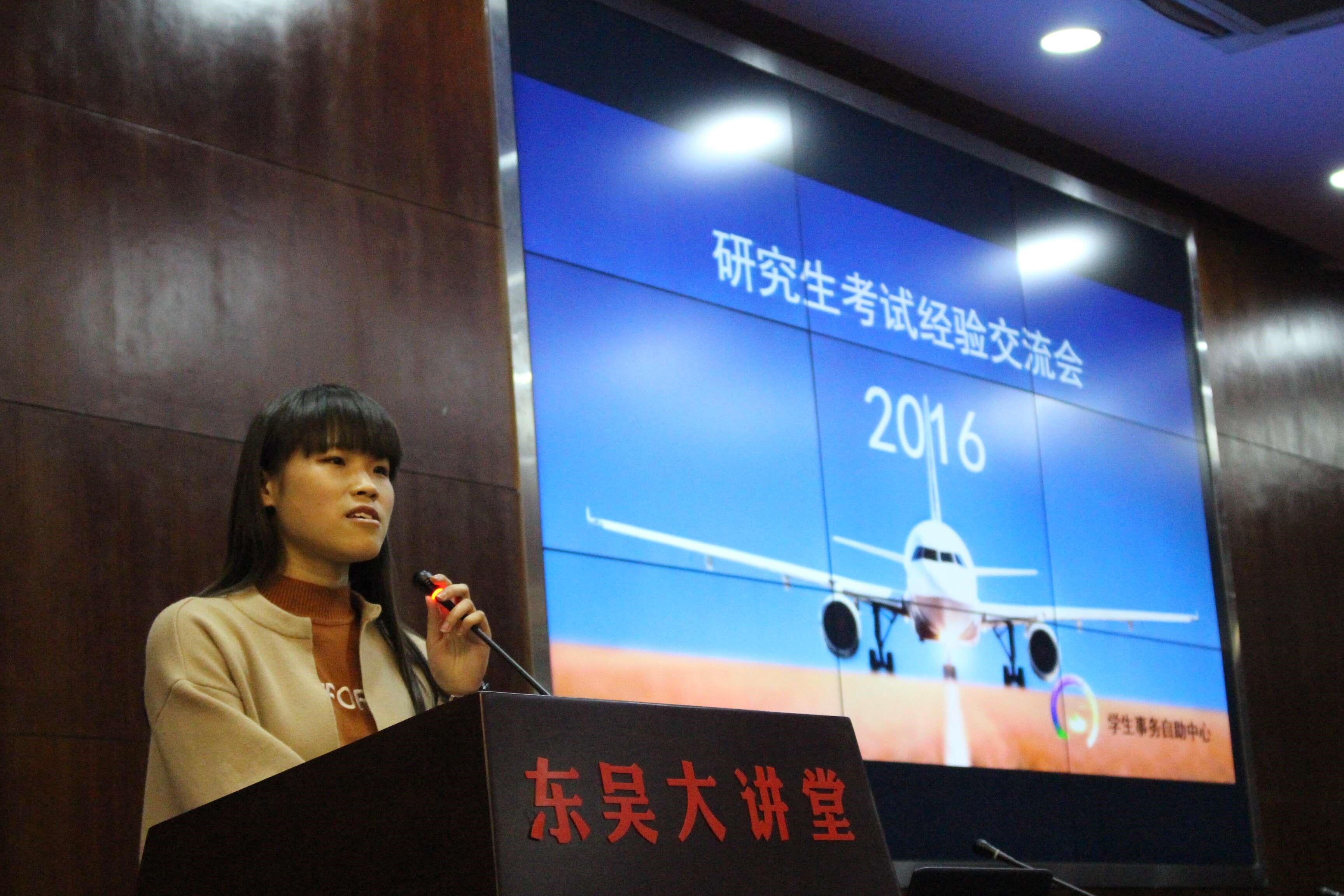 随后是爽朗风趣的宋明鸣学姐,她考上的是成人影片 的经济法专业。她认为考研最重要的是了解自己的情况,思考自己想要过什么样的生活做好短期或长期的规划。从自己情况出发的同时,对照学长学姐的经验。谦虚的学姐认为自己成绩不是特别好,一开始她也并没有考研的打算,但准备司考时发现基础不好,而如果毕业后的工作与专业无关会感觉很不甘心,可自己跟别人竞争的时候也优势不大。正是这种不甘心和不屈服,她决定去考研,以此增强专业的知识。她还提到如果同时准备司考和考研,要考虑自己有没有很强的能力和心态,毕竟压力大而且时间紧。学姐说自己司考后出去玩了一趟才回来准备考研,以此放松心情,清空司考带来的负面影响。随后学姐说了报考本校的优势:笔试不是特别难(但苏大录取人数少),资料收集方便,复习也轻松,还有学霸的讲义,精力分散得也少。最后学姐强调了缓和心态的重要性,不要陷入恶性循环。