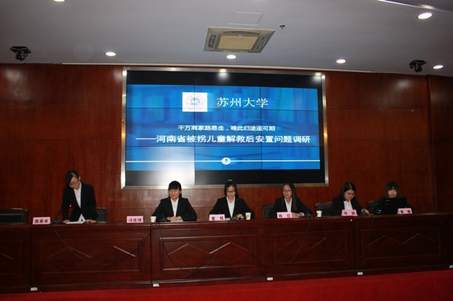 接着,“河南省郑州、开封 、洛阳被拐儿童解救后安置问题”调研团队进行团队汇报。队长聂茜卓通过一段视频让同学们了解到我国被拐儿童问题的严重性,并且以课题综述为中心,讲解了课题背景及目的意义。她依次讲解了调研历程和安置难题以及反思和感悟。调研团队的指导老师梁君林教授也发表点评,他认为团队所选的课题主题新颖精炼,并对团队的精诚合作表示赞赏。
