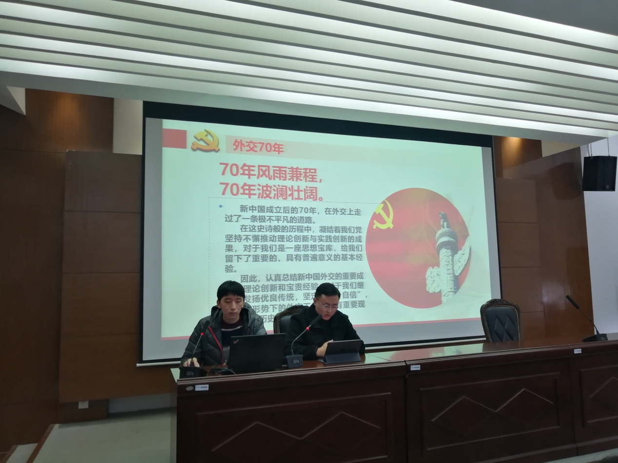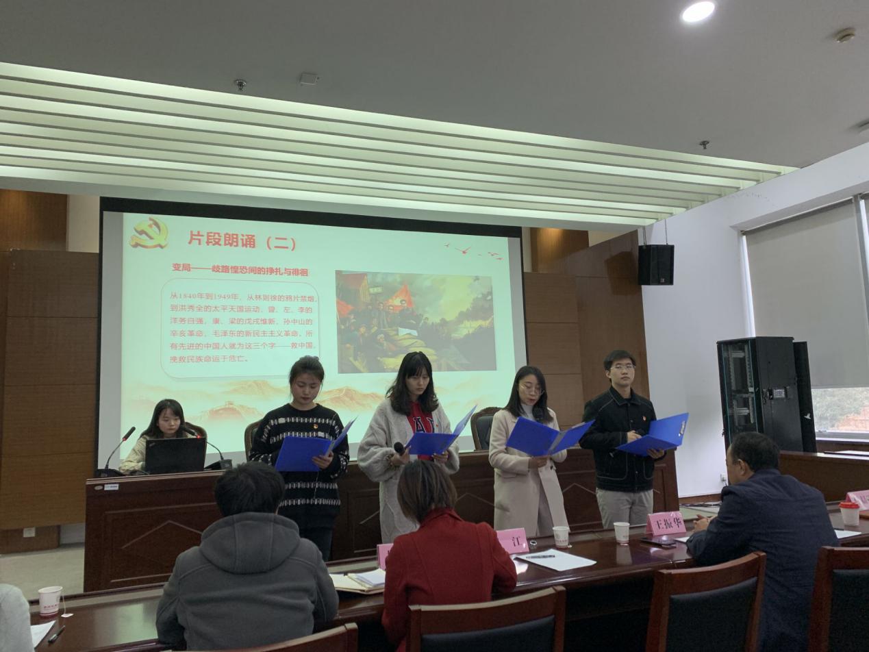 接着,是预备党员的读书报告会,四组同学用不同的形式展现了各小组的读书心得,第一组和第四组以ppt汇报形式进行读书感悟主题演讲,第二组第三组以片段朗诵的形式向大家展示各自的读书体验,形式多样,情感丰富,深入浅出。