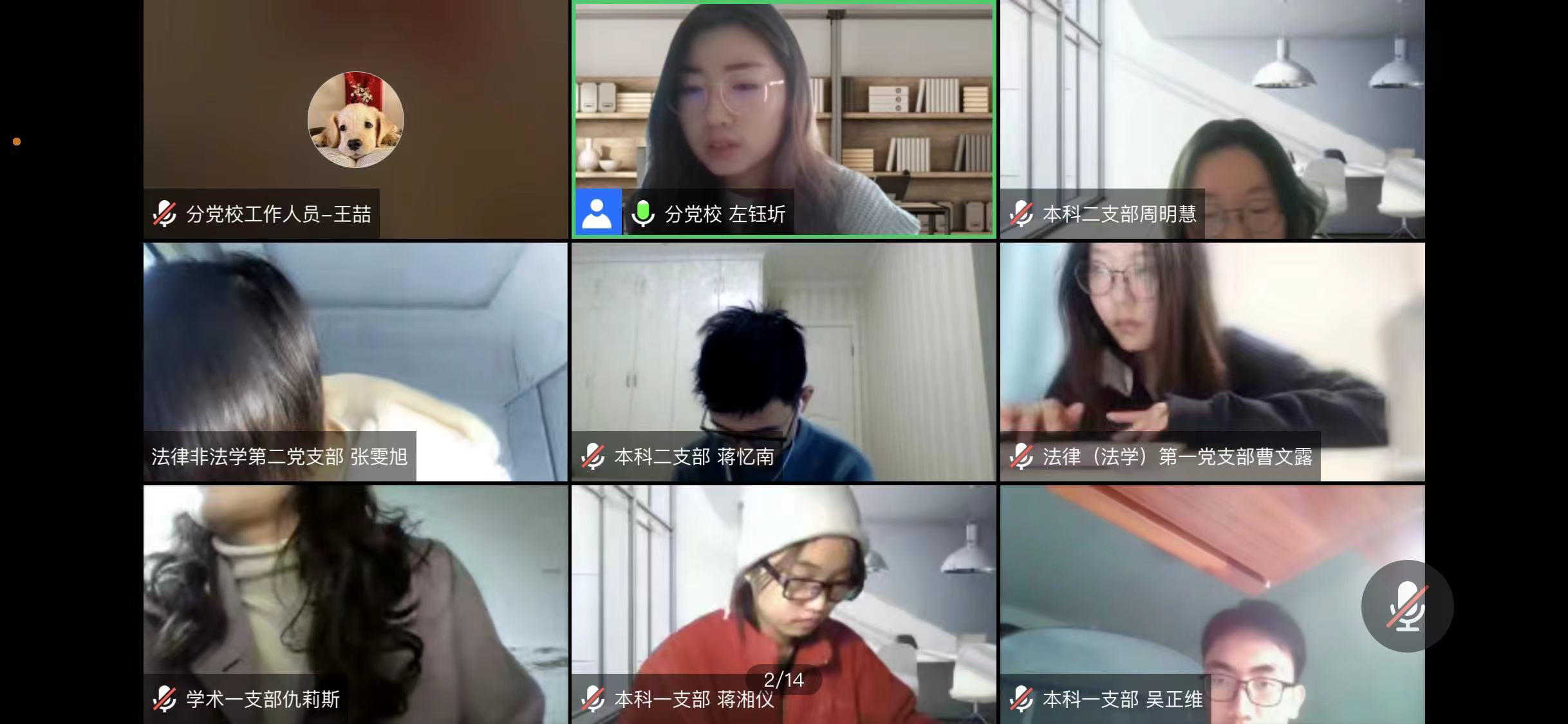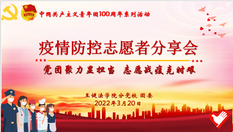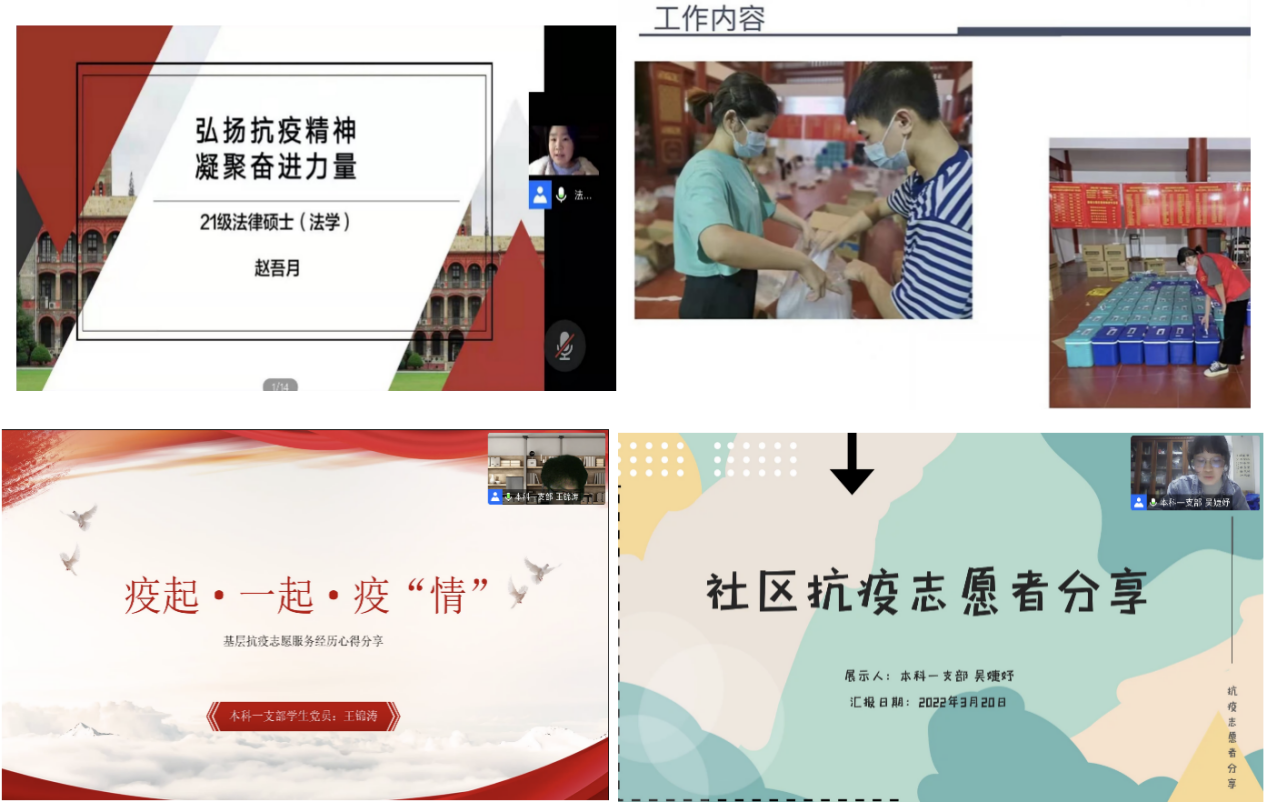 接着,法律硕士(法学)一支部、21级法律硕士(法学)班级的党支部书记赵吾月同学以《弘扬抗疫精神,凝聚奋斗力量》为题,分享了她的抗疫经历,让我们看到了青年党员挺身而出,甘于奉献的青春姿态。法律硕士(非法学)二支部、21级法律硕士(非法学)班级的团支部书记蔡进萍同学由于家乡突发疫情,积极参到核酸物资的配送工作中,无法线上与我们互动交流。她提前录制好视频,以这样特殊的方式与大家分享她的抗疫故事,这也让我们看到青年党员听从指挥、争做表率的责任与担当。本科一支部、19级知识产权班的院团委委员王锦涛同学,以《疫起·一起·疫“情”》为题,分享了他为期一个多月的志愿服务经历,尽己所能参与抗疫服务工作,充分发挥了党员模范的示范作用。本科一支部、18级法学一班、曾任成人影片 团委副书记的吴婕妤同学为我们分享了她在社区参加的抗疫志愿服务经历,让我们看到成人影片 青年积极投身一线,在疫情防控中勇担使命的实际行动。