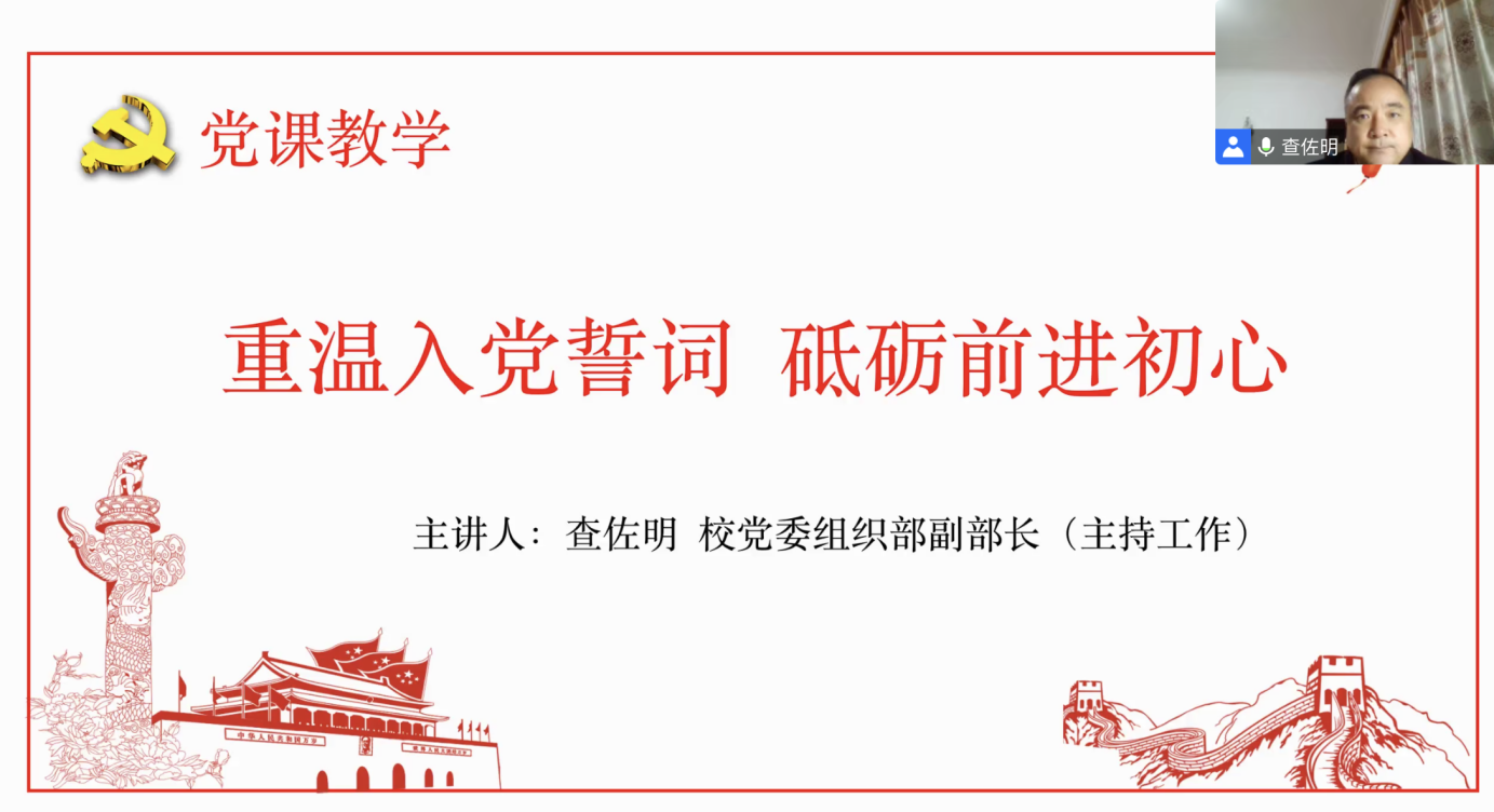 开班典礼结束后,校党委组织主持工作的部副部长查佐明老师为全体学员上了第一堂党课。查部长带领学员们回顾建党历史,重温入党誓词,砥砺前进初心。他围绕入党誓词的历史演变、精细解读、初心砥砺三部分展开并作深刻阐述。