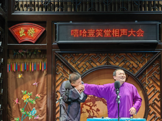 古街文化淳朴香,相声快板响四方。傍晚,学员们跟随央视栏目组在苏州市平江文化中心感受相声文化的魅力,一袭大褂立于台上,欢声笑语聚于台下。作为非遗珍馐之一的相声文化自清末流传至今,在嬉笑怒骂中,承载着中国人的喜怒哀乐。当晚的每一段演出不仅在说学逗唱之间演绎百态人生,还传递着社会主义新时代文明建设精神。《大保镖》中快递小哥的欢乐经历体现着社会主义市场经济中的职业精神、《风花与血月》中不同民族表达爱意的习俗体现着民族文化的多样性,也强调了尊重保护民族文化的必要性。演员将传统文化与现代精神文明建设巧妙结合,富含雅韵的同时给观众带来了欢乐。