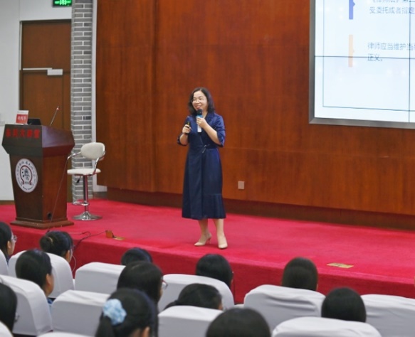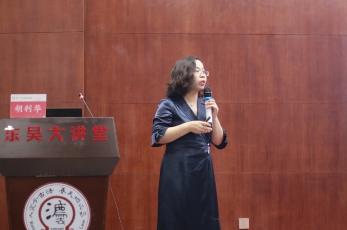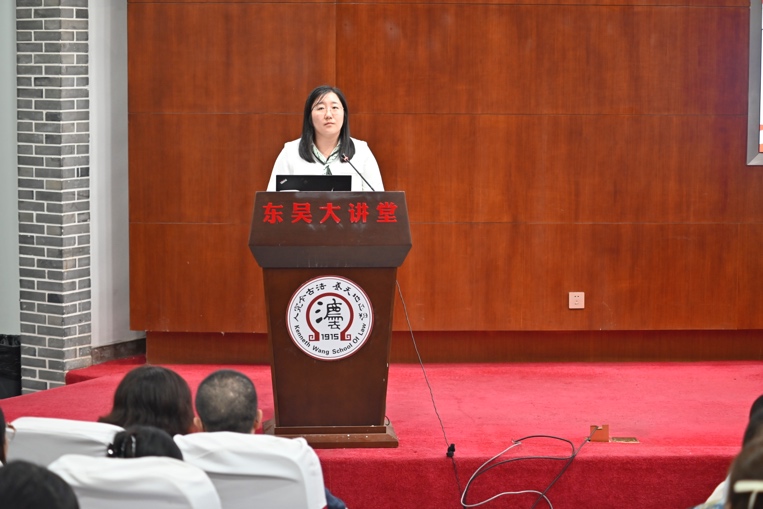 接着,荣获2023年“全国律师行业优秀共产党员”称号的校友胡利华,以“理想照进现实——法律人的律师实践之路”为题给学员们带来了一节别开生面的党课。她从自己与苏大的渊源谈起,呈现了自苏大学子到商事律师的完美蜕变。她对自己的职业路径进行纵向剖析,从发展经历中提炼经验,为学员们提供了学习和生活等方面的指导。她强调“法学理论知识”和“学术规范”固然重要,但是由正义、公平所构成的“法律人的底线”才是执业过程中应始终坚守的。“律师无权无势,最大的武器是对法律的信仰;律师最知人间疾苦,理应对社会饱含温情”。随后,胡利华律师与学员进行真诚交流,就职业前景、为人处事、专业能力等方面给出了指引。