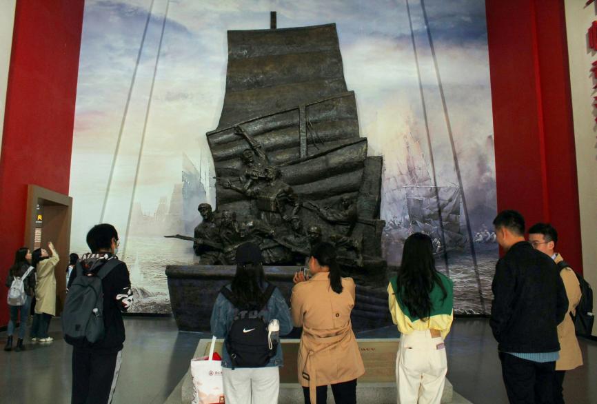 再往里坐落着渡江战役纪念馆,学员们驻足在雕像与展示柜前,认真听取讲解、了解历史细节,在一张张图片、一件件文物、一封封家书中重温那段风雨如磐的岁月,先辈们以坚定的理想信念、革命到底的斗争精神,“肩住了黑暗的闸门”,迎来渡江战役的胜利与新中国的成立。