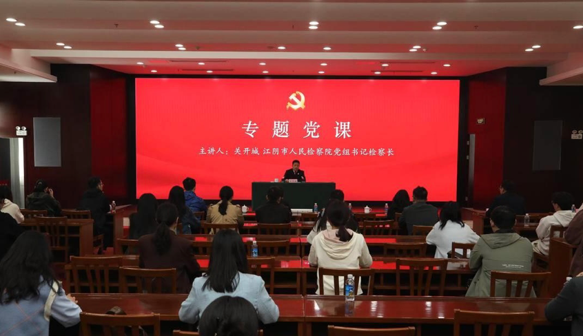 4月21日上午,关开城检察长讲授专题党课,他介绍道,江阴市人民检察院是全国模范检察院,五年来共有29个案件入选全国、全省检察机关典型案例,275个典型案事例被新华社、中央电视台等主流媒体关注报道。他指出,司法工作者要以“高质效办好每一个案件”作为基本价值追求,坚持为大局服务、为人民司法、为法治担当,切实提升党建与业务深度融合的实效水平。最后,他鼓励同学们积极投身检察事业,为我国法治建设贡献力量。