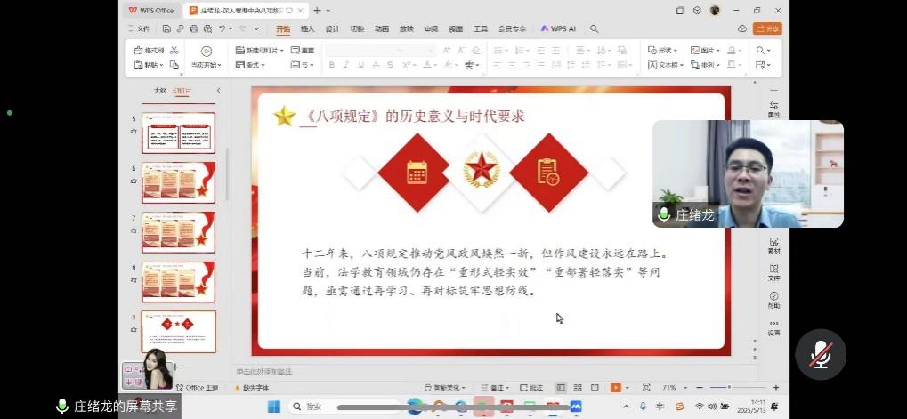 随后,庄绪龙老师从理论与实践两个层面深刻阐述了青年法学学子深入贯彻中央八项规定精神的重要意义。在理论层面,他指出在百年未有之大变局下,我们党面临的“四大考验”具有长期性和复杂性。贯彻中央八项规定精神是我们党自我革命的重要抓手,每位党员都应成为“持之以恒加固中央八项规定精神堤坝”的践行者。在实践层面,他着重强调青年时期是价值观形成和确立的关键时期,必须“扣好人生第一粒扣子”。而对学生党员而言,更应当将党的纪律刻印在心,培育廉洁自律的职业操守,这不仅关乎个人成长,更影响着法治中国建设的未来。最后,庄绪龙老师呼吁同学们要自觉将中央八项规定精神内化于心、外化于行,踔厉奋发、笃行不怠,做廉洁自律的先锋引领者,为法治中国建设注入青春力量,奋力谱写为中国式现代化挺膺担当的青春篇章。