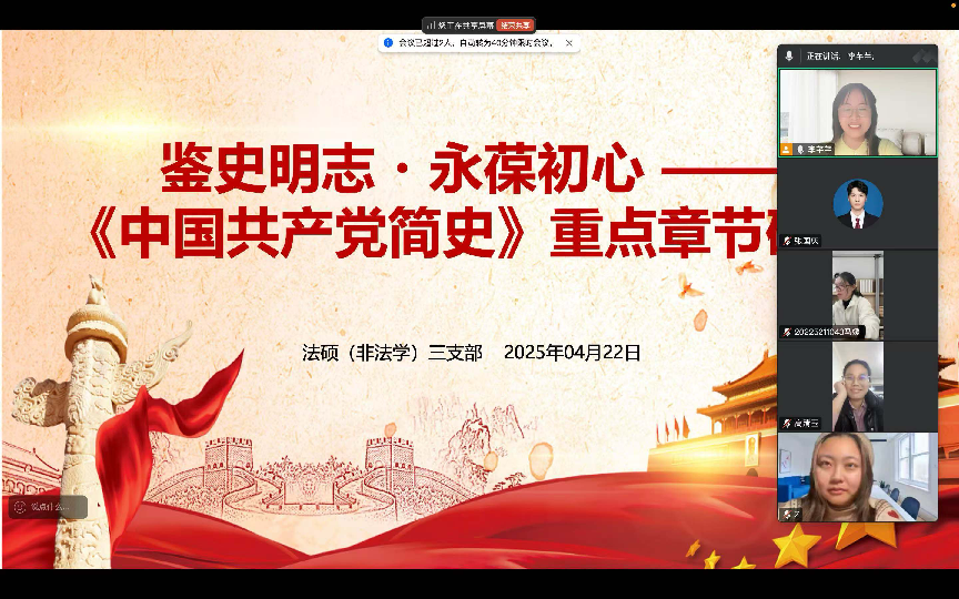 4月22日,法硕非法学三支部组织召开“鉴史明志·永葆初心”主题党日活动,通过学党史、观警示、深研讨,激励全体党员从历史中汲取力量,在警示教育中锤炼党性。