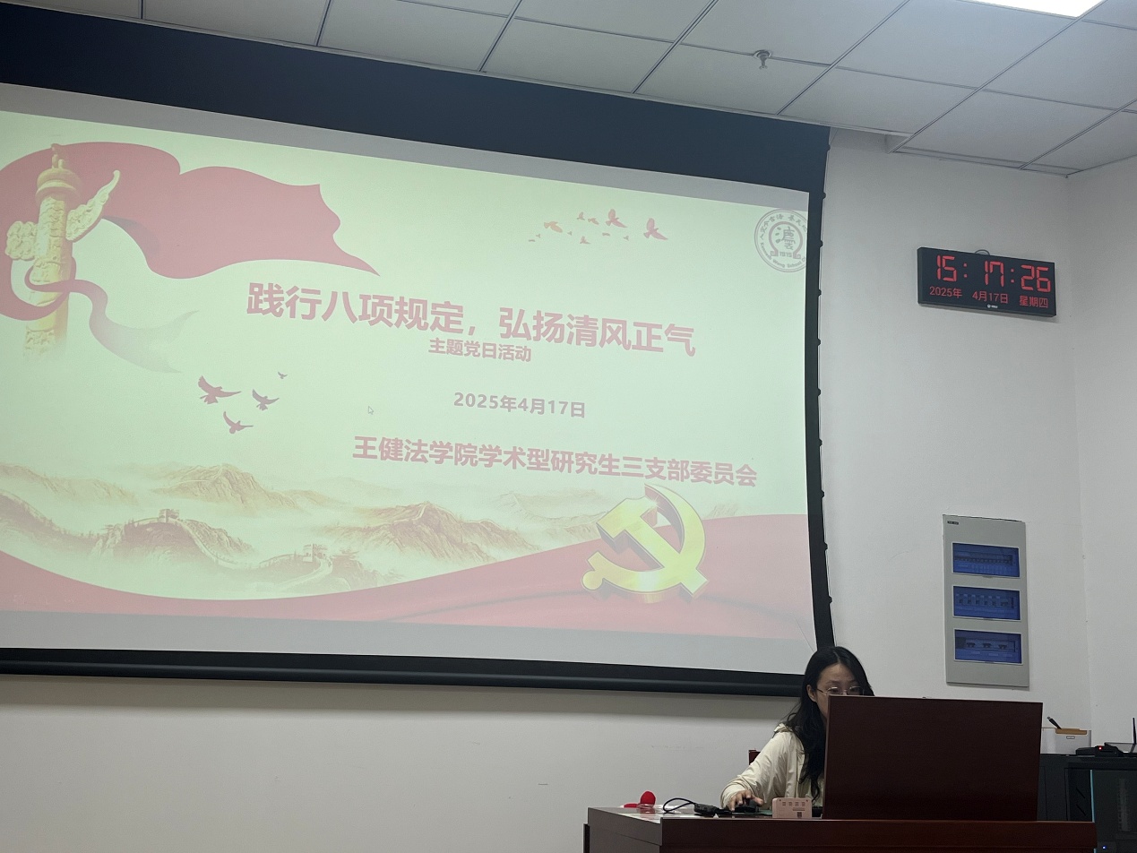 为深入贯彻落实全面从严治党要求,进一步加强党风廉政建设,深入贯彻中央八项规定精神,进一步增强党支部党员的政治意识和纪律意识,2025年4月17日下午,成人影片 学术型研究生第三党支部开展“践行八项规定 弘扬清风正气”主题党日活动。本次活动由党支部书记栗嘉曼主持,支部全体党员参与。