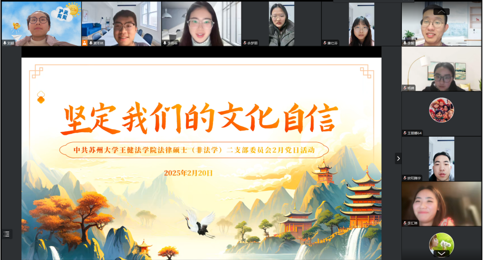 法律硕士(非法学)研究生二支部委员会于线上以腾讯会议的形式召开了以“坚定我们的文化自信”为主题的党日学习教育活动,本次会议由党支部委员夏冬林主持,全体党员同志参加会议。