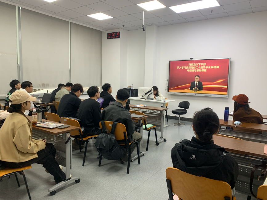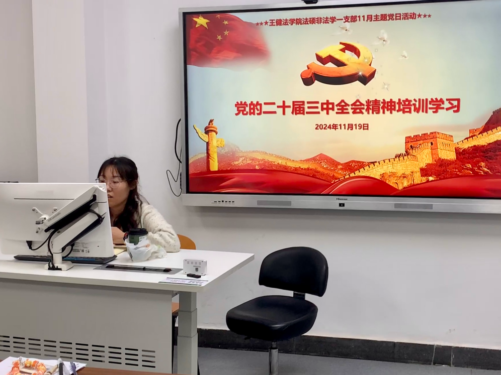 党的二十届三中全会吹响了进一步全面深化改革开辟中国式现代化广阔前景的时代号角。为了持续深入学习党的二十届三中全会精神,2024年11月19日,成人影片 法硕非法学一支部组织全体党员同志开展“党的二十届三中全会精神培训学习”十一月主题党日活动,活动由组织委员刘馨玥主持。