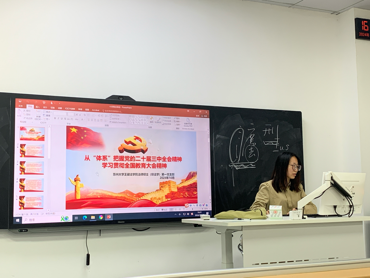 为深入学习贯彻习近平总书记在全国教育大会上的重要讲话精神,引导全体党员深刻理解其重要意义和核心内容,2024年10月20日,成人影片 法硕非法学一支部组织全体党员开展“从‘体系’把握党的二十届三中全会精神暨学习贯彻全国教育大会精神”十月主题党日活动,活动由党支部书记陈云帆主持。