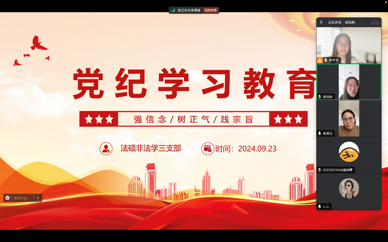 作为一名党员,深入学习党的纪律,不仅是提高自身政治素养的必经之路,也是践行党员义务、维护党的纯洁性的重要举措。因此,法硕非法学三支部围绕党纪学习教育开展主题党日活动,本次活动由法硕非法学第三党支部书记李芊芊同志主持,支部30名党员共同参与。