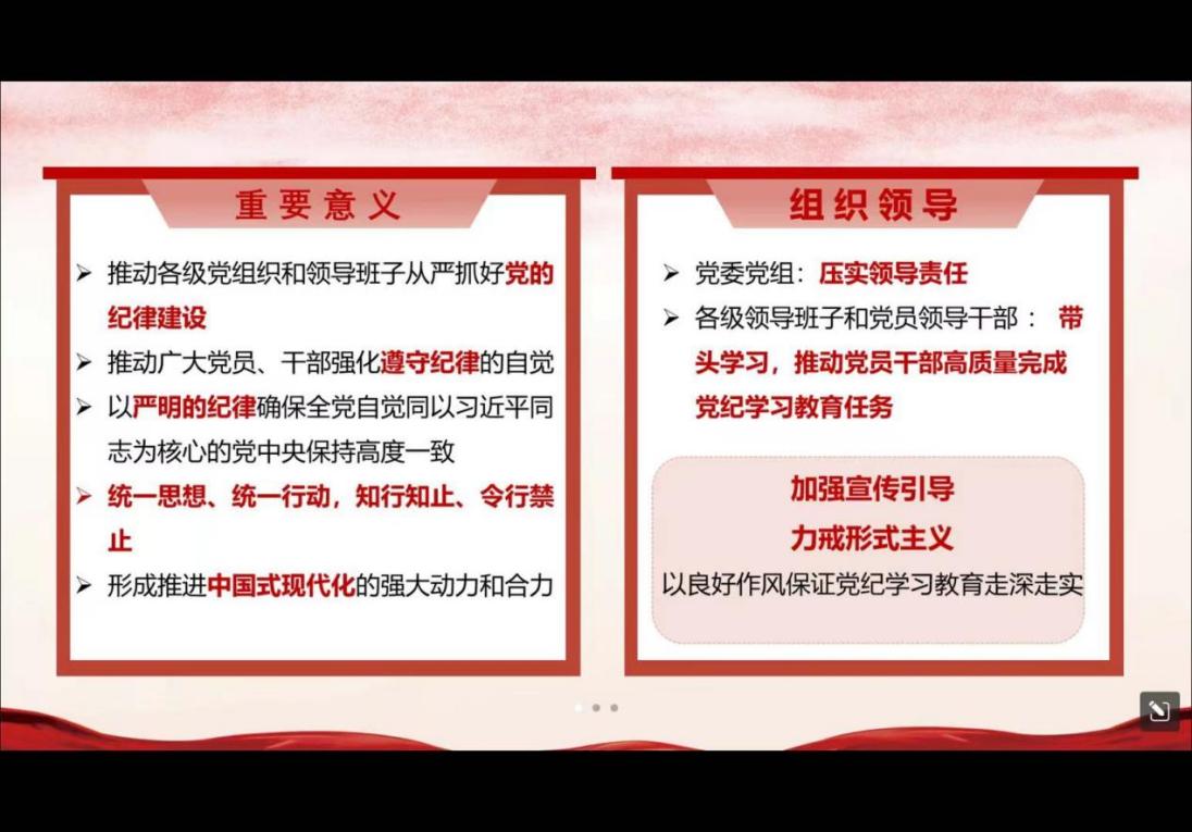 通过学习党纪和集中交流,使支部党员深刻认识到党纪学习的重要性。而党纪学习教育需做在日常、融入平常,与党性教育、廉洁教育结合起来,真正心有所畏、言有所戒、行有所止。各位党员也表示要以党纪为总纲,夯实思想根基,以党纪为标尺,时刻正身力行,以党纪为明镜,映照初心使命。