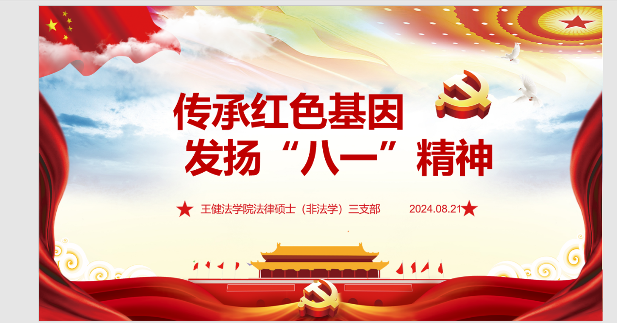 2024年8月21日,法硕非法学三支部开展传承红色基因 弘扬“八一”精神主题党日活动,本次活动由法硕非法学第三党支部书记李芊芊主持,支部30名党员共同参与。