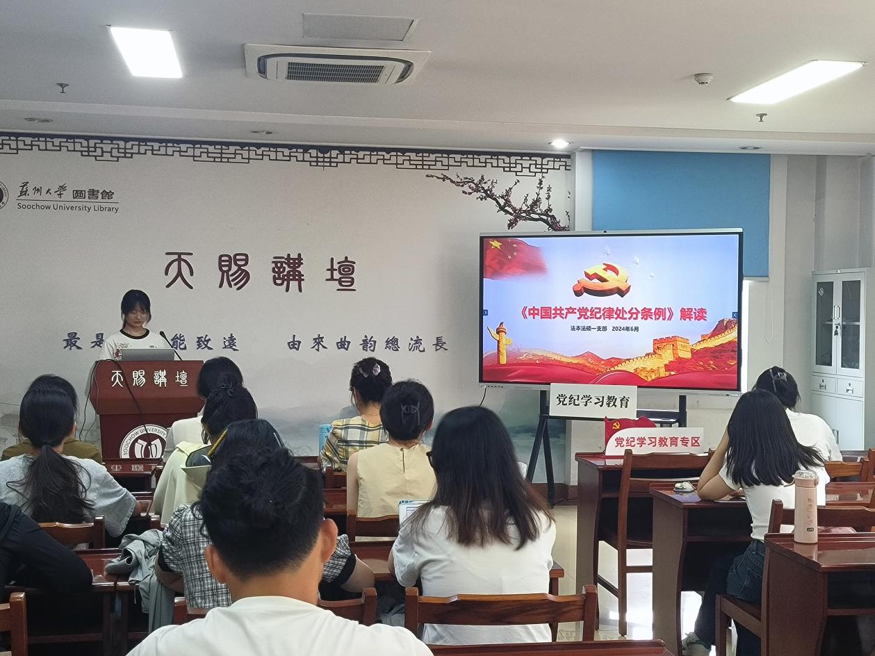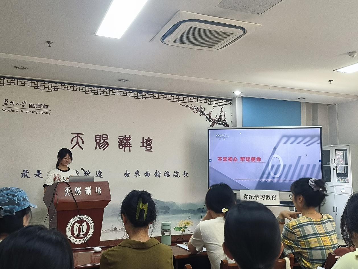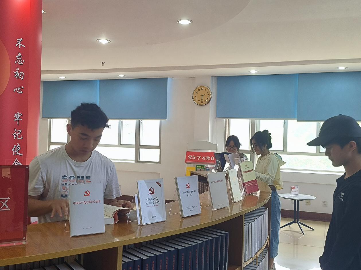 随后,全体学生党员移步本部图书馆二楼的“宣讲教学区”开展支部大会。整个会议议程包括以下三项:第一,支部书记带领各位党员同志学习《中国共产党纪律处分条例》原文;第二,观看警示教育片,并进行感悟分享;第三,支部成员在本部图书馆二楼的“阅读学习区”进行参观、阅读。