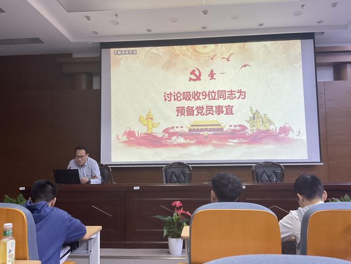 会议第一项议程,讨论吸收朱怀阳等9位同志成为中共预备党员。会上,各同志向大会汇报自身情况并宣读入党志愿书,入党介绍人逐一发表考察对象一年内的相关表现,支部书记单杰老师结合政治审查结果与党内外群众意见向支部大会作汇报。随后,与会党员发表意见,并对发展对象能否入党进行了充分讨论,采取无记名投票方式进行表决,会议一致同意接收朱怀阳、杨凯程、李圆圆、吕霖、李瑞莹、柯奚劼、蔡依辰、刘姝妤、吴英梅9名同志成为中共预备党员。