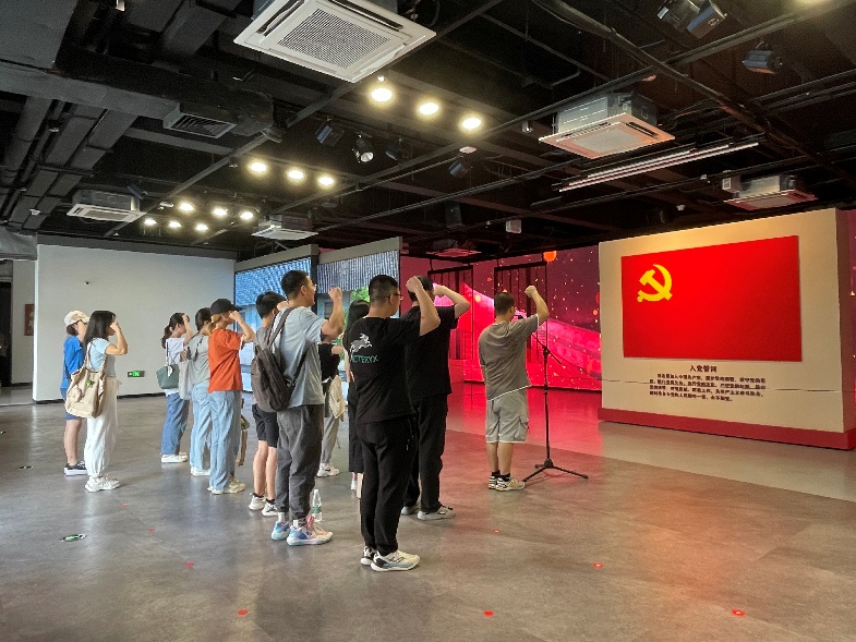 在参观过程中,支部书记陈智伟带领全体党员面向鲜红的党旗,重温入党誓词,坚定入党初心,筑牢忠诚信念。在铿锵有力的宣誓声中,支部党员仿佛看见了宣誓入党的那天自己眼中坚定的光芒,仿佛看见了革命先烈们以行动诠“誓”、以生命践“誓”,他们忠诚笃定的信念散发着震撼人心的光芒。