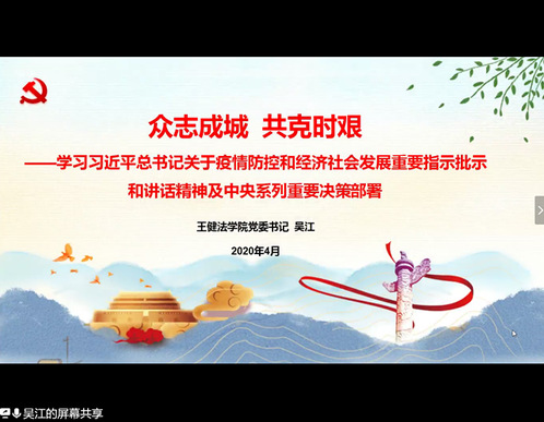 疫情防控工作的简要回顾”这三方面展开。吴江书记以播放视频的形式给大家展示了疫情发生以来,以习近平同志为核心的党中央开展的一系列战疫工作,带领大家从八个方面学习了习近平总书记关于疫情防控和经济社会发展作出的系列重要指示批示讲话精神以及中央的重要决策部署,并谈了个人的学习体会,和大家共勉。最后,吴书记从成人影片