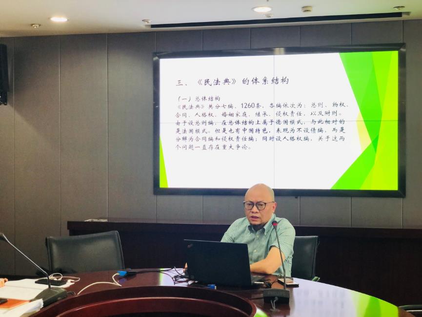 院长方新军围绕《民法典》解读作重点发言。他引用习近平总书记在中央政治局第二十次集体学习时发表的重要讲话阐述了颁布实施《民法典》的重大意义。他从宏观角度介绍了《民法典》编撰的历程、大致的体系,并以案例分析的形式解读了与校园内部治理、经济社会民生密切相关的条款,比如物业维修基金使用的表决、房屋继承权中的居住权问题、救死扶伤的法定救助义务等。方新军的发言系统全面、重点突出、深入浅出。