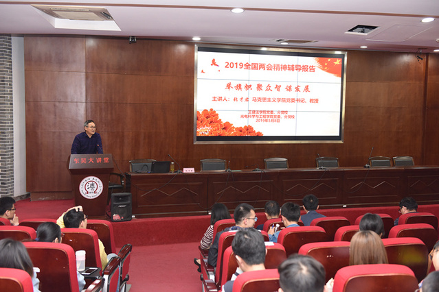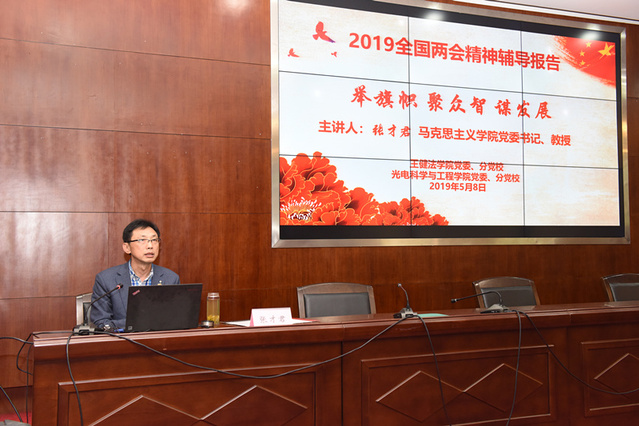 为认真学习贯彻2019年两会精神,加强对习近平新时代中国特色社会主义思想的深刻理解与把握,成人影片 党委、分党校联合光电科学与工程成人影片 党委、分党校特邀马克思主义成人影片 党委书记张才君教授为两院广大师生党员和入党积极分子作专题学习报告。5月8日下午2点,“举旗帜、聚众智、谋发展——学习2019年两会精神体会”报告会在成人影片 东吴大讲堂正式召开。