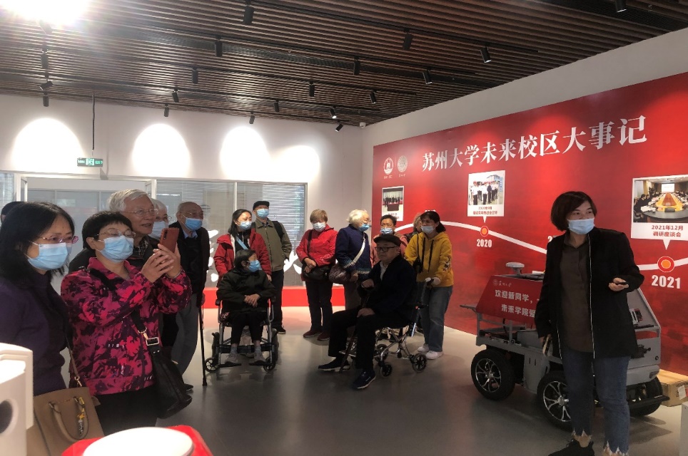 科技感十足的教学楼,宽阔的操场,现代化的教室,还有苏大的红砖墙和拱门,东吴大学的石牌门,吸引着老教师们驻足拍照留恋。老教师们感慨于科技的日新月异,赞美着新时代的幸福生活。