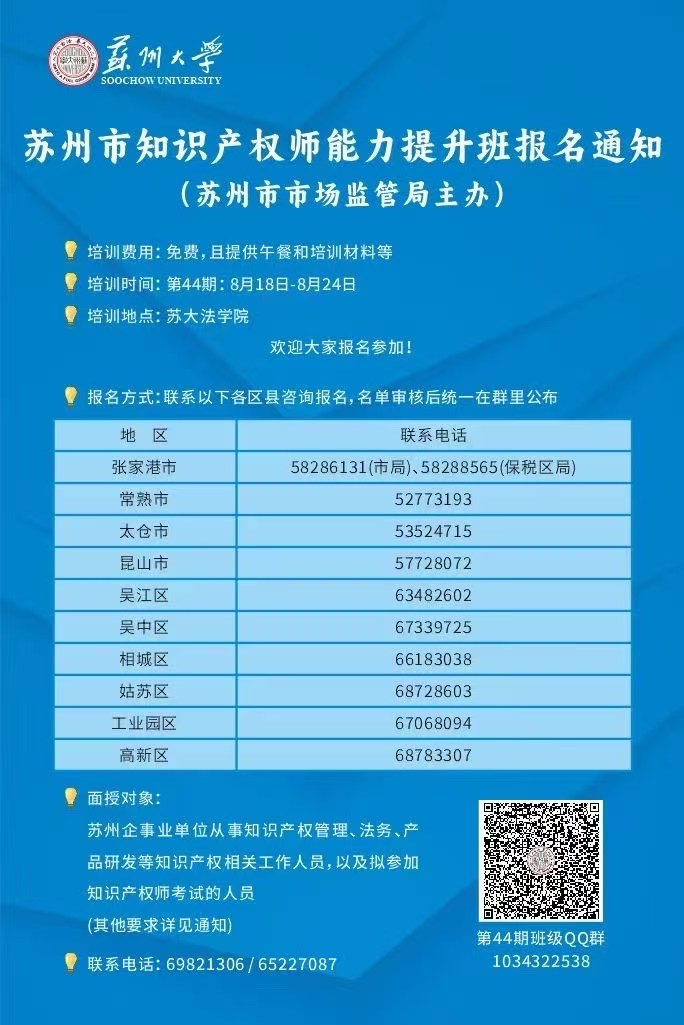 苏州市知识产权师能力提升班将于8月18日开班,报名可联系以下各区县咨询电话。(本期培训不收取培训费)