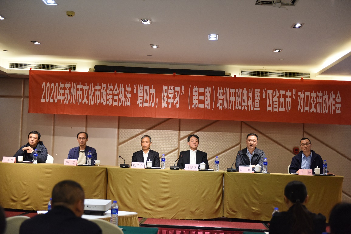 2020苏州市文化市场综合执法“增四力,促学习”(第三期)培训班暨“四省五市”对口交流协作活动培训班开班典礼于2020年11月4日下午1点30分在苏州市姑苏区干将东路的温德姆花园酒店宋厅举行。