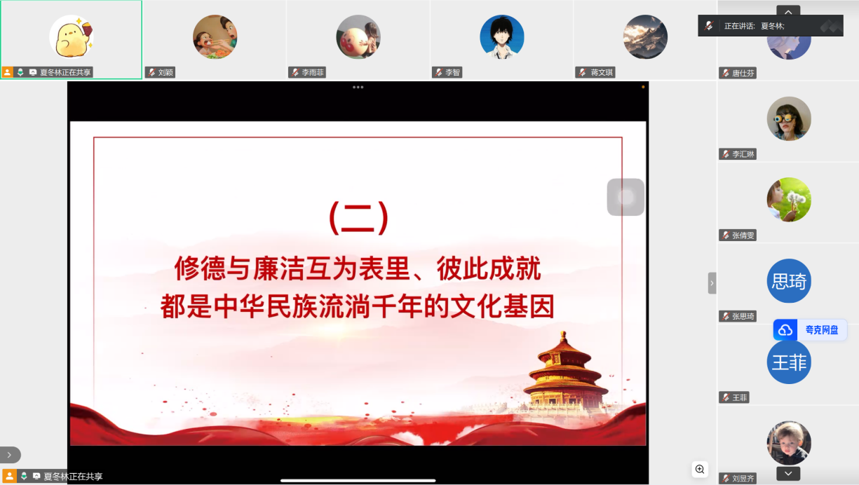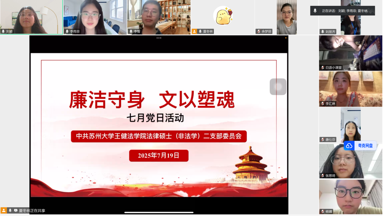 法律硕士(非法学)研究生二支部委员会于线上开展了以“廉洁守身 文以塑魂”为主题的党日活动,本次会议由党支部委员夏冬林主持,全体党员同志参加会议。
