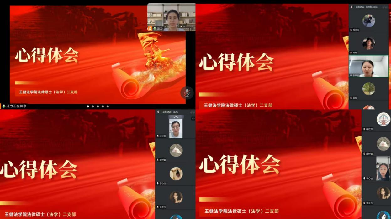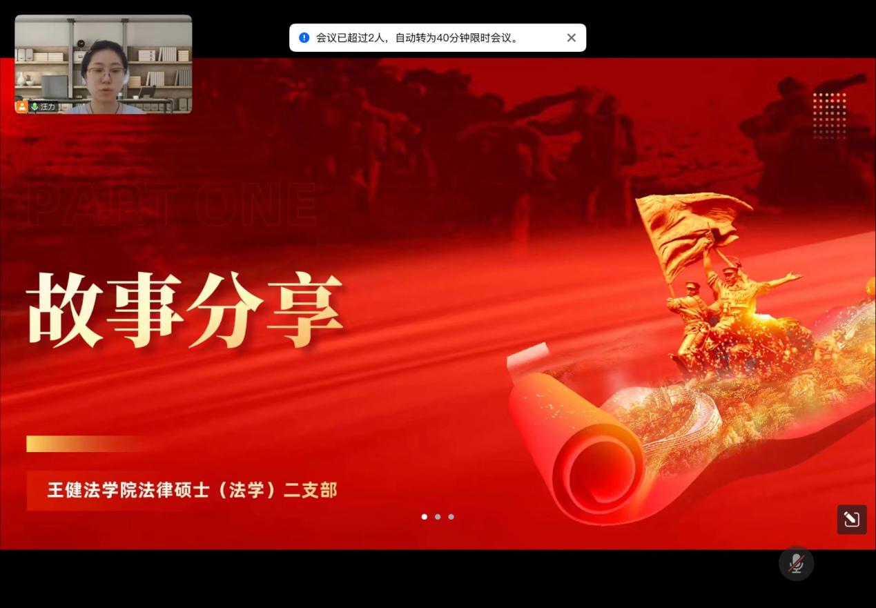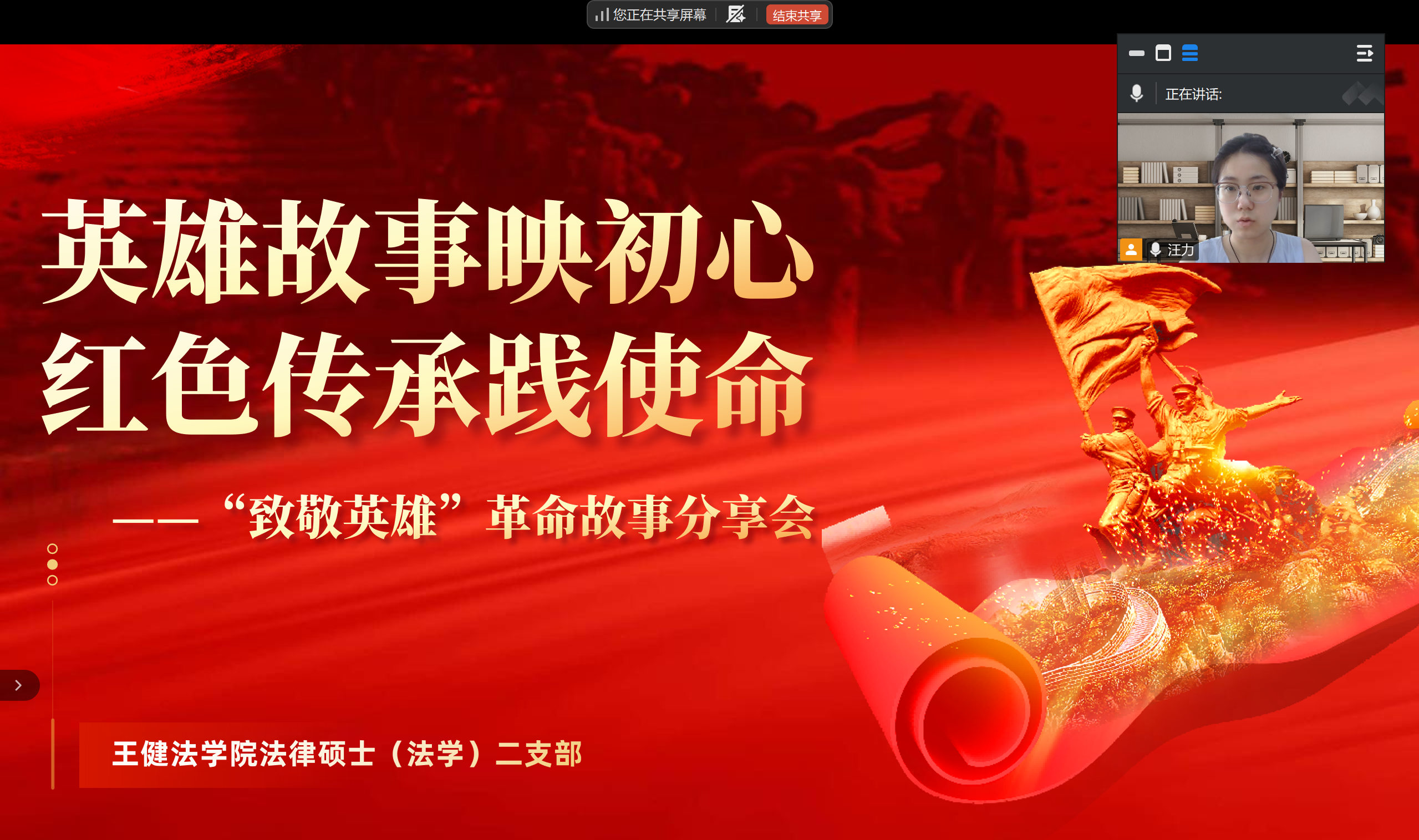 为传承革命精神,汲取奋进力量,8月22日下午,法律硕士(法学)二支部在线上平台开展8月主题党日活动,支部全体党员参与此次活动。本次活动主题为“英雄故事映初心,红色传承践使命”——“致敬英雄”革命故事分享会,活动由党支部书记汪力主持,组织委员孙在学、纪检委员陈科、宣传委员雷屹楠分别分享革命英雄故事,党员们在交流讨论中深化感悟,凝聚奋进共识。
