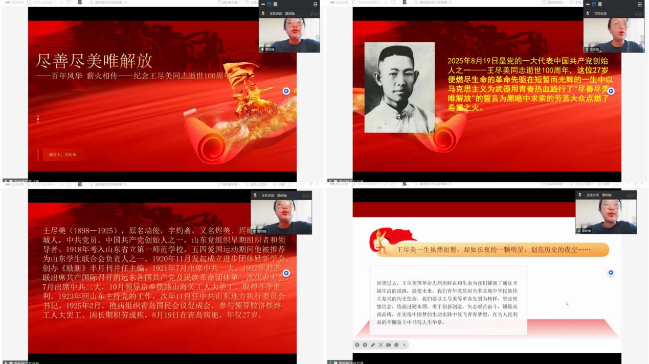 雷屹楠同志以王尽美同志1921年出席中共一大时的照片切入,讲述这位山东党组织创始人29年短暂而璀璨的一生。从组织济南早期工人运动,到领导山海关铁路工人大罢工;从拖着病体奔走于京沪铁路沿线传播革命火种,到弥留之际仍用颤抖的手写下“全体同志要好好工作”的遗嘱,勾勒出这位“尽善尽美唯解放”的革命家,如何用生命践行“我们要为天下人谋幸福”的初心,让在场党员深刻理解了“奉献不是选择,而是革命者的生命本能”的精神内核。