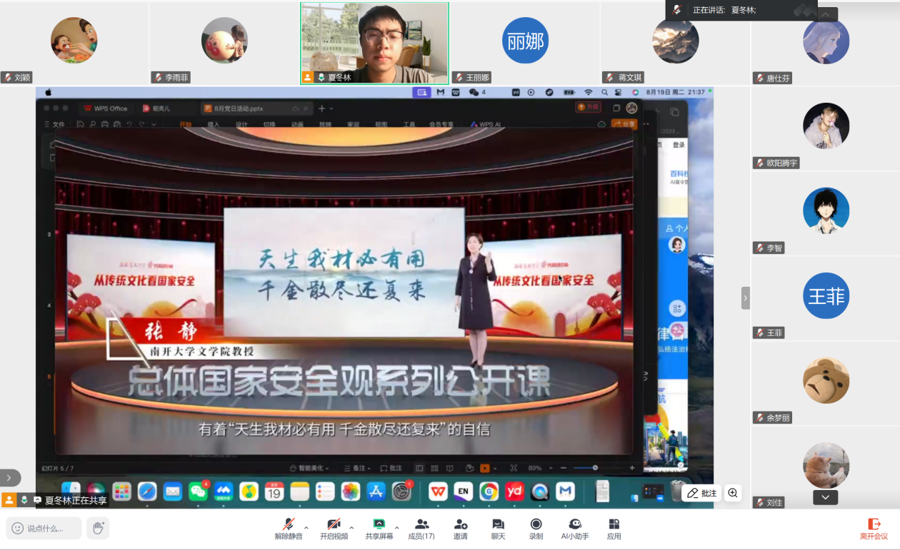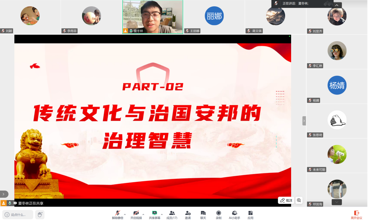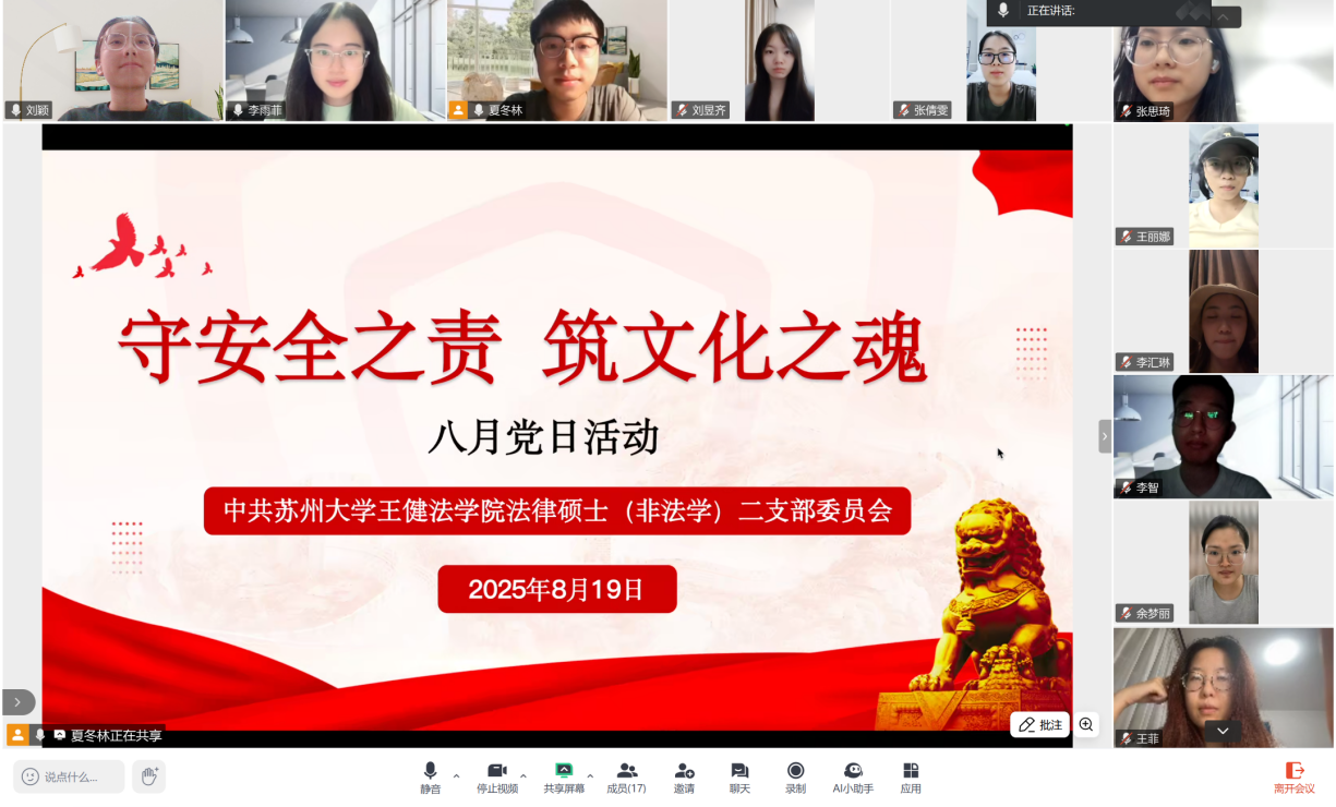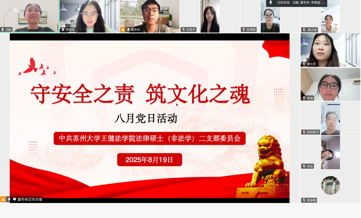 法律硕士(非法学)研究生二支部委员会于线上开展了以“守安全之责 筑文化之魂”为主题的党日活动,本次会议由党支部委员夏冬林主持,全体党员同志参加会议。