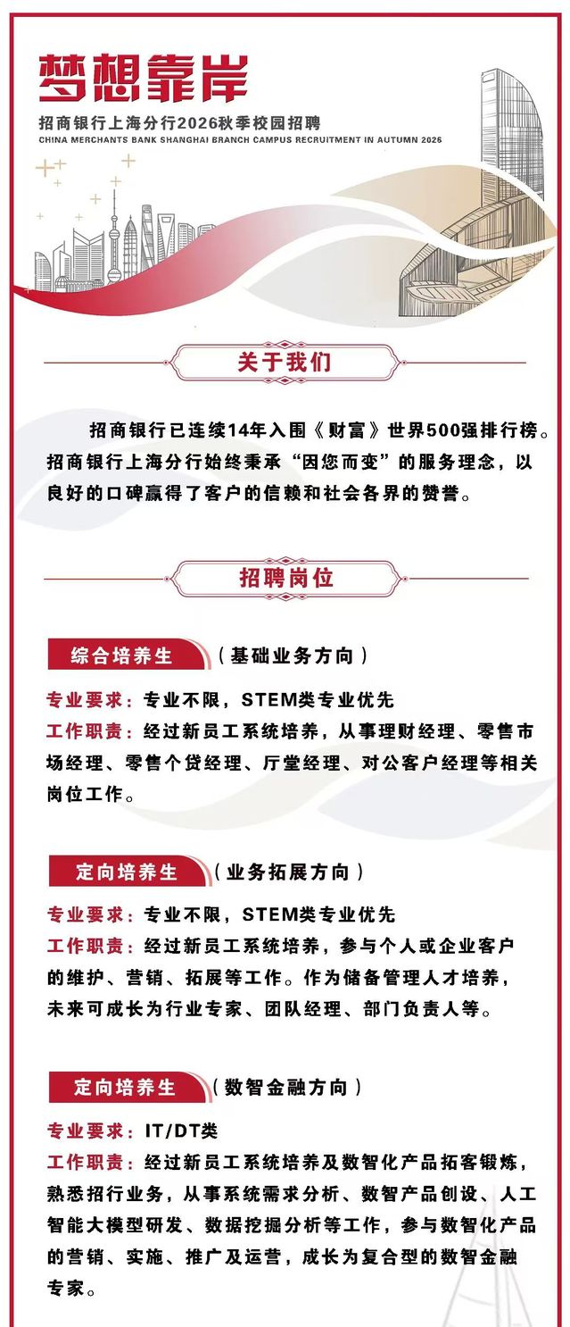 “梦想靠岸”招商银行上海分行2026校园招聘
