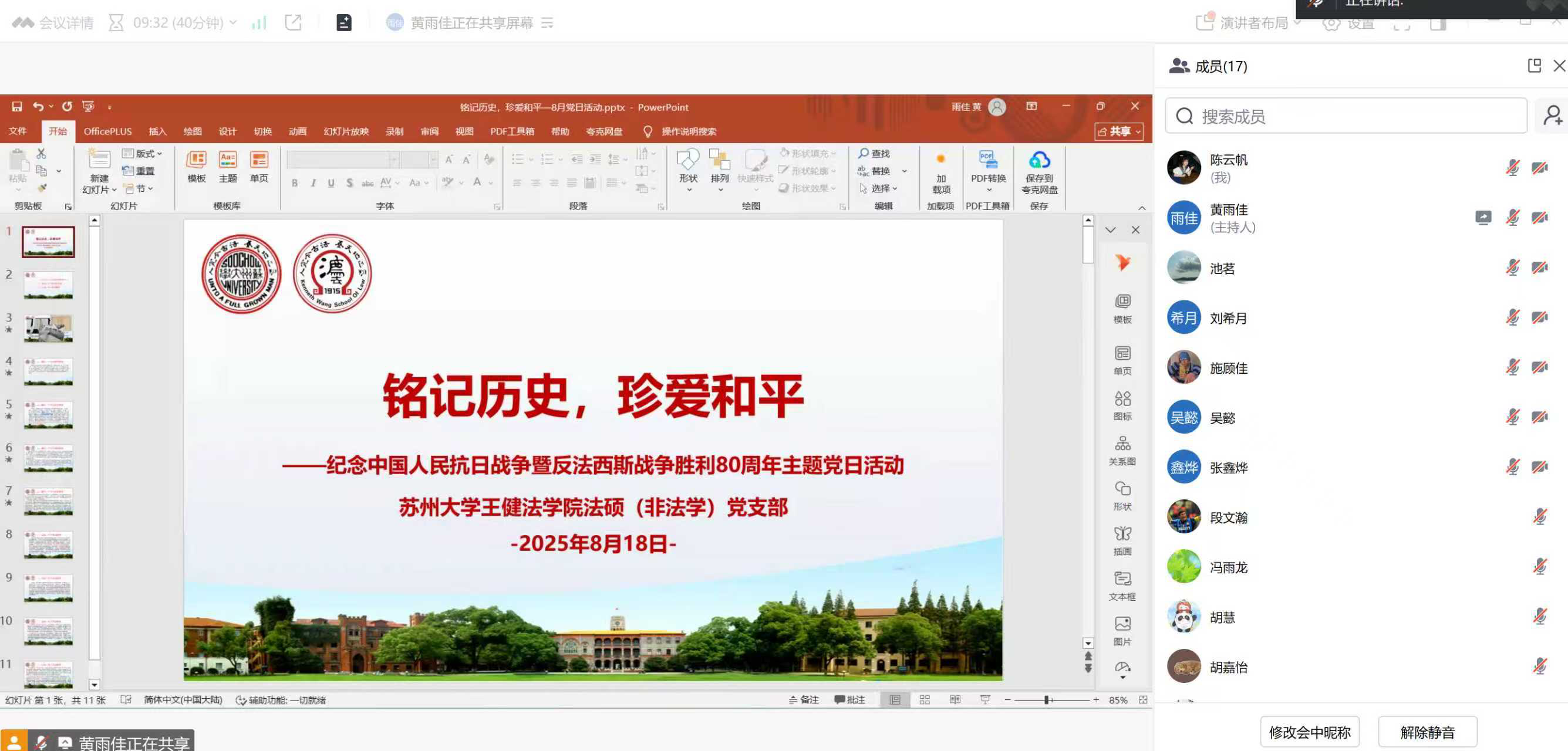 在中国人民抗日战争暨世界反法西斯战争胜利80周年之际,成人影片 法硕非法学一支部于8月18日组织全体党员深入学习中国抗日战争精神,纪律委员黄雨佳同志为大家带来了一场深刻的党史课。