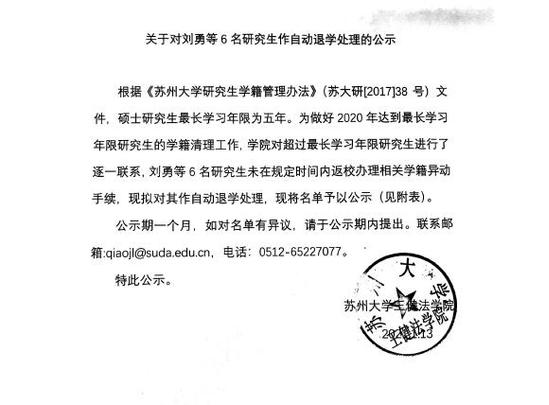 关于对刘勇等6名研究生作自动退学处理的公示