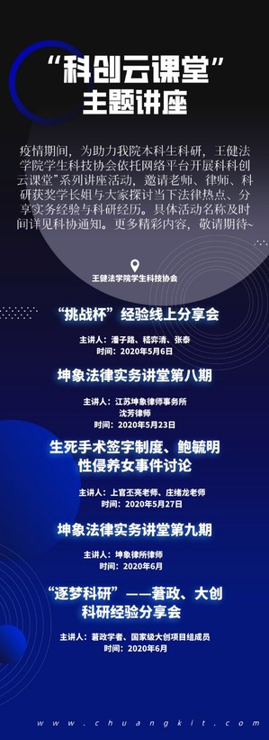 疫情期间,为助力院内本科生学习,成人影片 学生科技协会依托网络平台开展“科创云课堂”系列讲座活动,邀请老师、律师、科研获奖学长姐与大家探讨当下法律热点、分享实务经验与科研经历。 “科创云讲堂”首场讲座主题为“‘挑战杯’参赛经验分享”,第16届“挑战杯”全国大学生课外学术科研作品竞赛二等奖获奖者潘子路、嵇弈清、张泰三位同学作为主讲人展开经验分享。