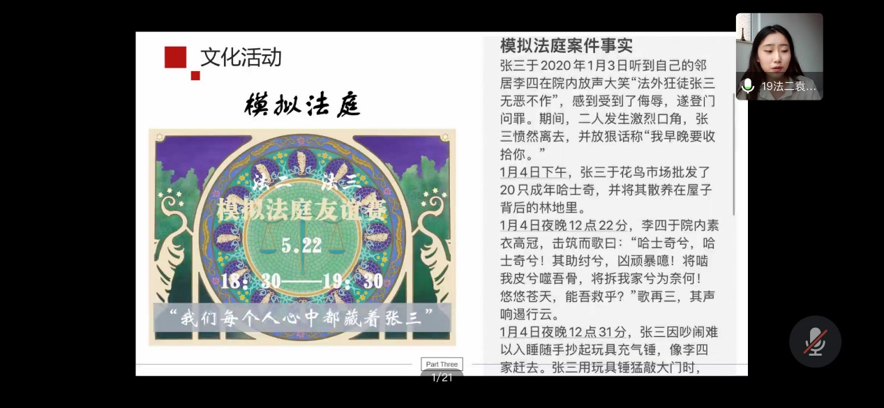 接着,18、17、19各班的班长在线上依次进行了PPT汇报展示。展示主要分为“班级介绍”、“数据展示”、“学霸笔记及经验交流”、“未来展望”四部分,向老师和同学们展示了各班创建优良学风班的举措与成效。他们用班级成绩优秀率、四六级通过率、参与科研等数据展现班级学风建设的成果,并分享班级创建优良学风的经验和举措。各班的汇报干货满满,观影学法、模拟法庭、学术讲座、科研竞赛、榜样示范等等,为优良学风的营造群策群力。不管是精心准备的PPT还是声情并茂的汇报,都让我们体会到了各班的用心,感受到了每个班级昂扬的斗志和蓬勃的朝气。班级汇报展示结束后,学生会代表方潇颖同学为大家带来了疫情期间成人影片 线上学风建设活动的展示,内容包括师生下午茶、学霸笔记评选、科创云讲堂等活动。这些活动响应了“停课不停学”的号召,不仅增进了师生间的情感,也充分展示了法成人影片 学子的学习热情与能力。